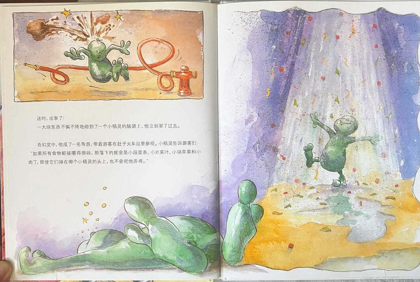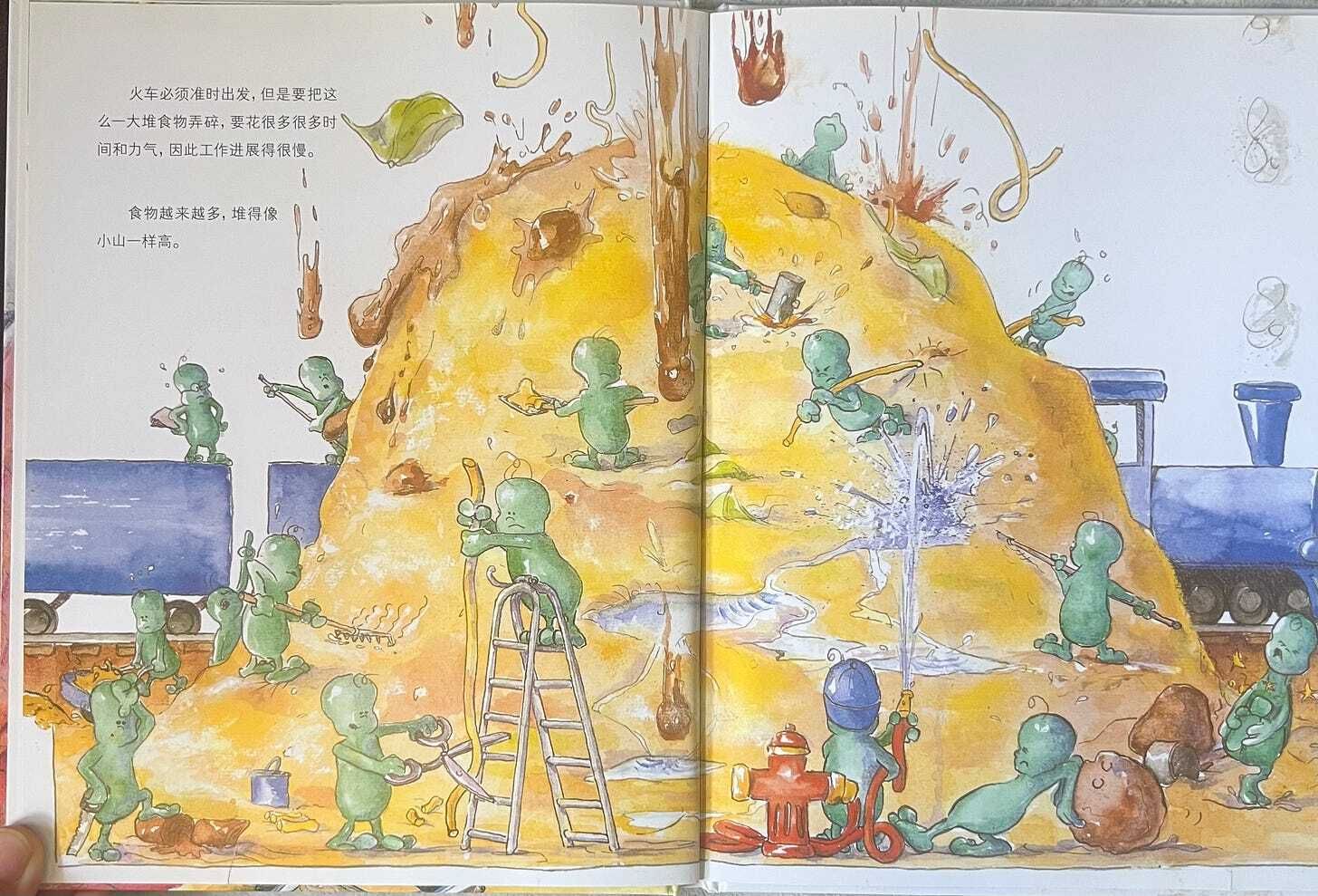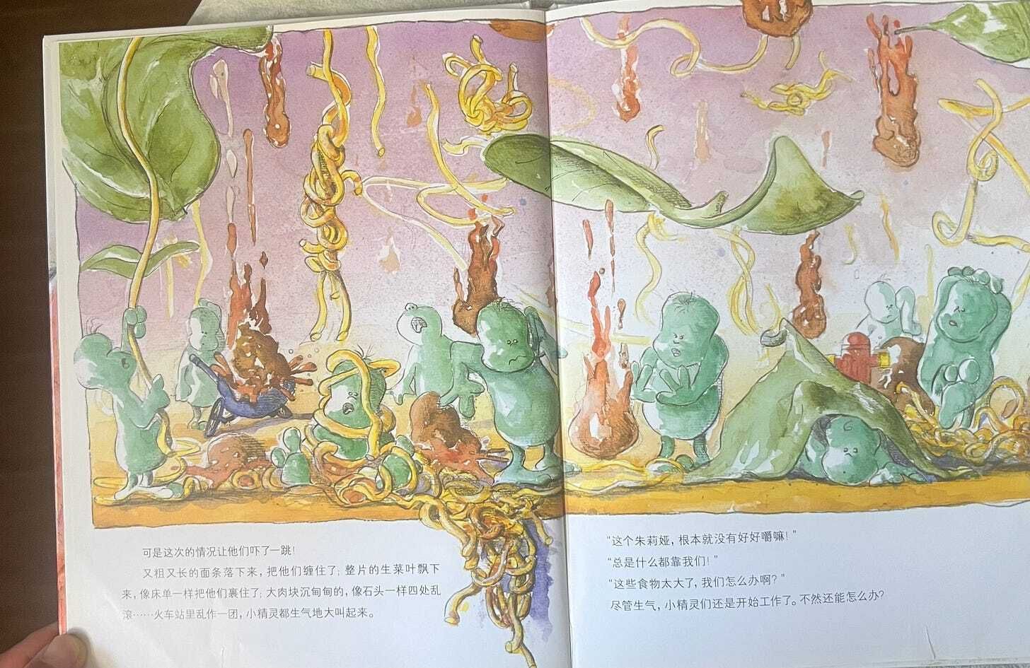 But this time, they were shocked! The long, thick noodles entangled them; whole lettuce leaves floated down, wrapping them like bed sheets; heavy meat chunks rolled around like stones. The train station was in chaos, and the elves were angrily shouting.